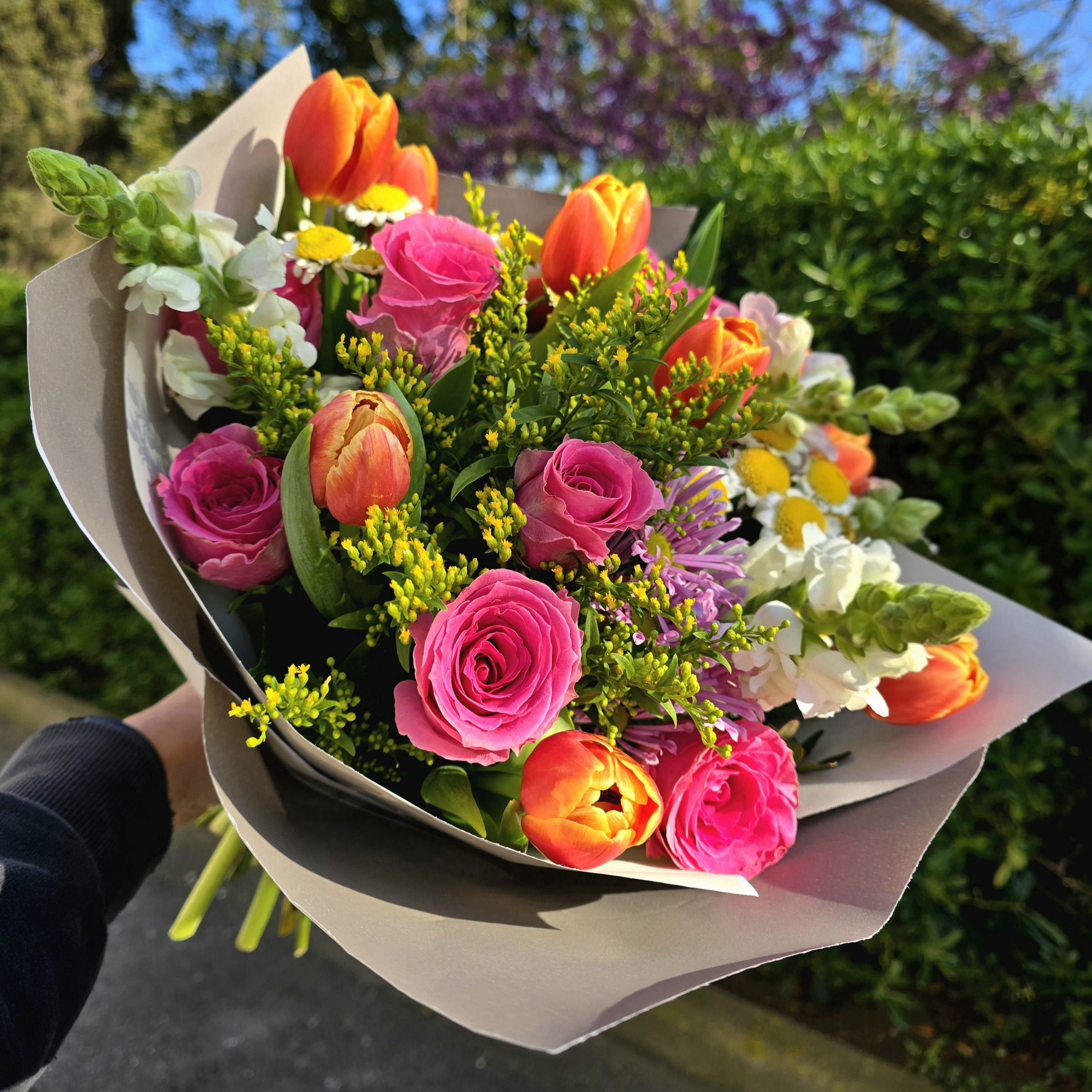 Un joli bouquet de saison associant aux tulipes des roses et autres fleurs champêtres.