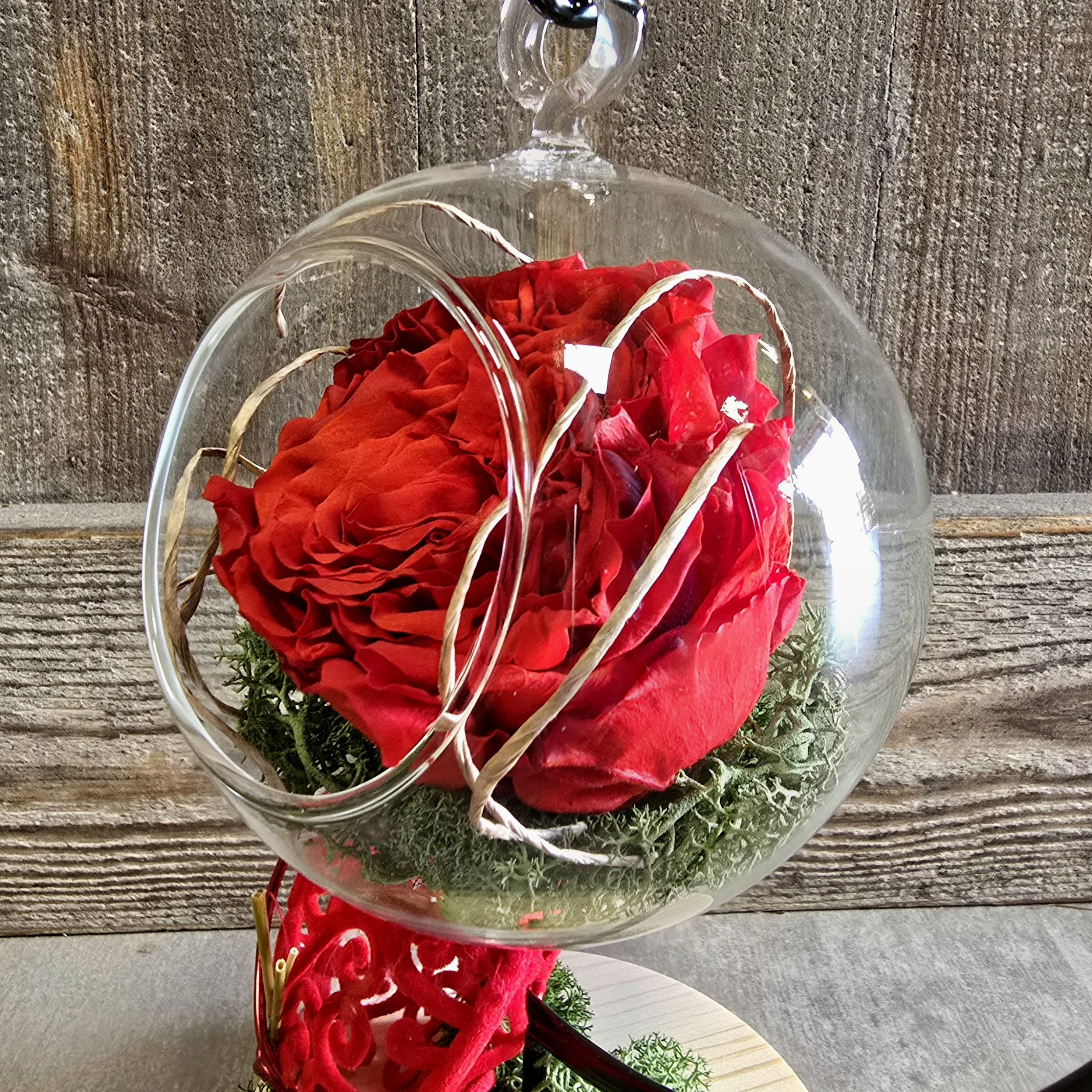 Une belle rose éternelle nichée dans un bulle de verre en suspension : un objet de décoration réalisé par nos soins pour exprimer l'amour avec un grand A.