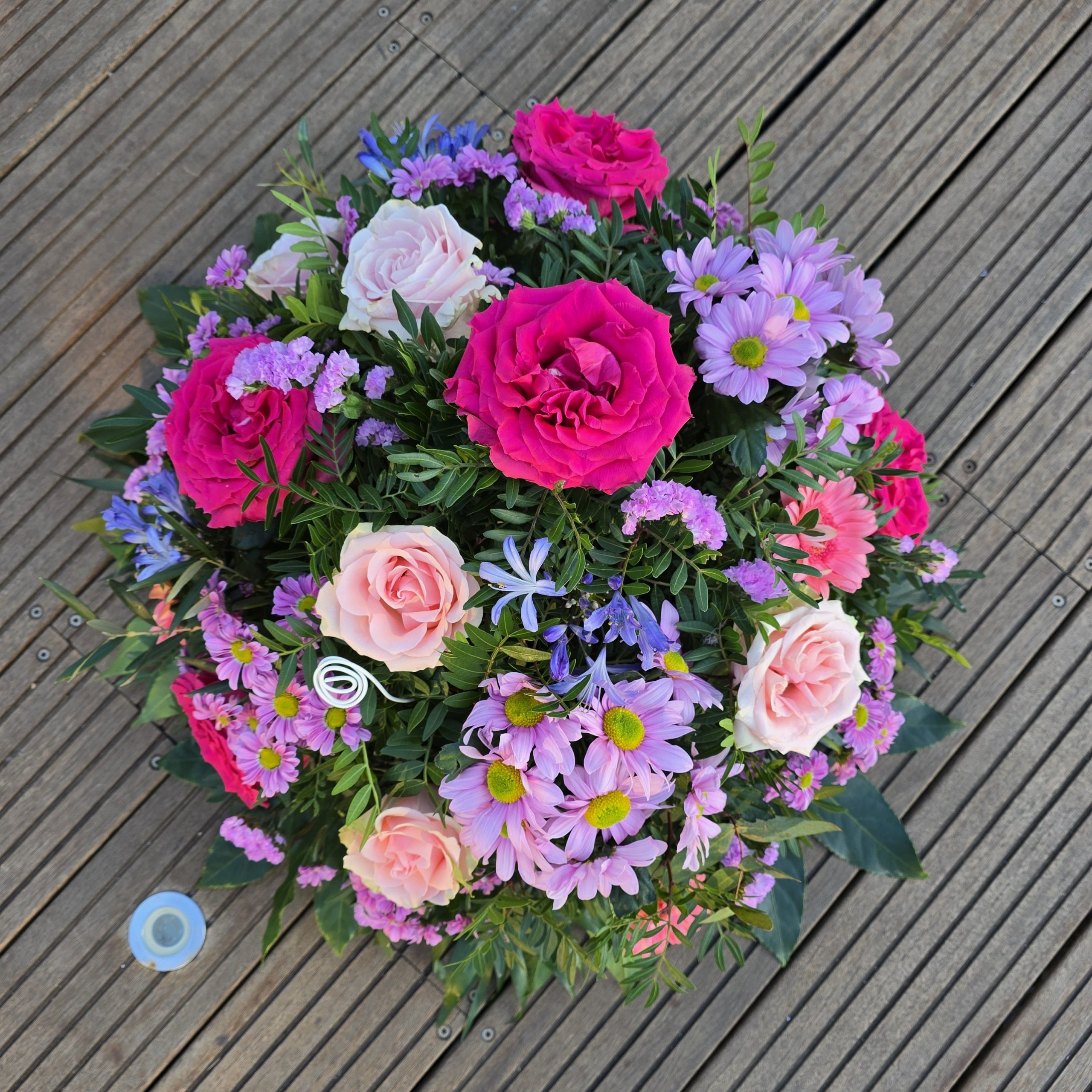 Le coussin rond est une pièce florale de forme ronde. Elle exprime un hommage discret et respectueux au proche disparu. Les fleurs de couleurs rose expriment la douce affection portée à la personne disparue. Celles de couleurs plus vives apportent de la vibrance à l'hommage.